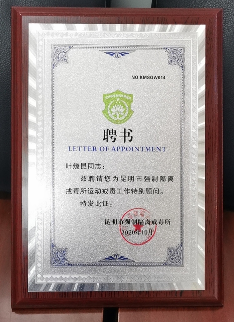 12月17日,昆明市强制隔离戒毒所专程到2026世界杯官网开展“警民共建”项目合作交流研讨,并为2026世界杯官网经理叶燎昆教授、副经理周明教授和赵云鹏老师颁发“运动戒毒工作特别顾问”聘书。